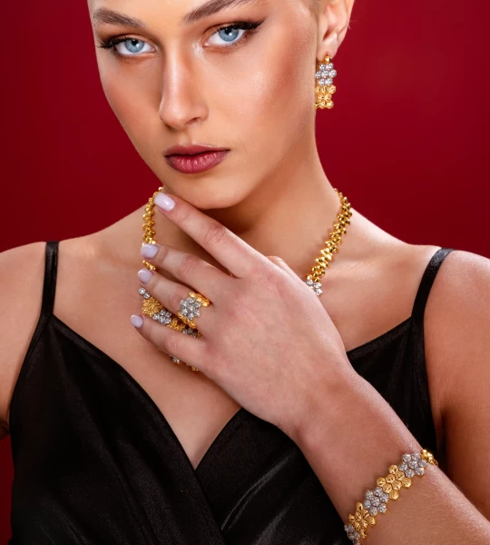 اجعلي من حولك يشعرون بقوة حضورك،اقتني هذا الطاقم المكون من سوار أنيق مع خاتم من الذهب الأبيض كما يحتوي على عقد فاخر وأقراط مميزة، ارتديه وانثري سحرك أينما تذهبين.